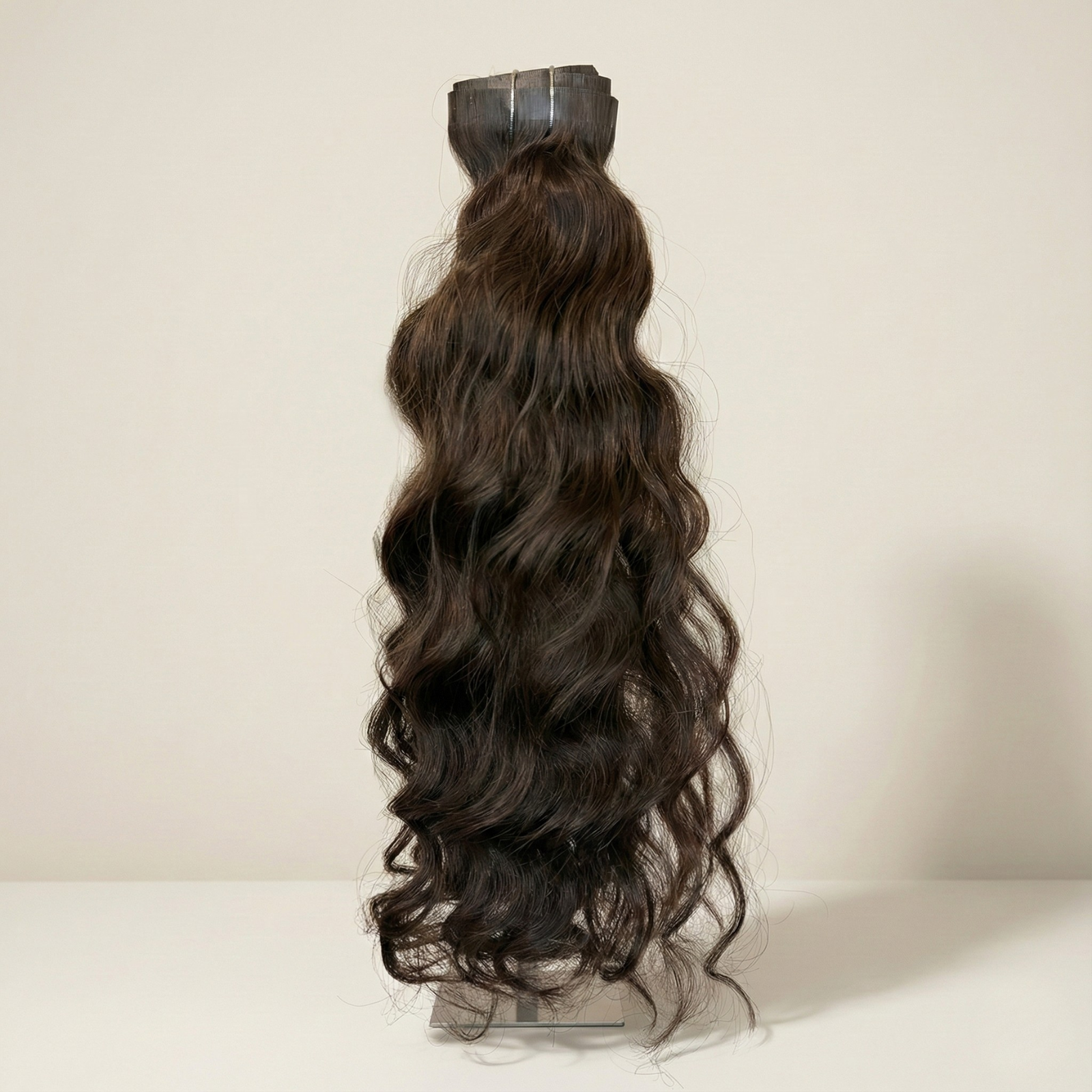 Tape extensions are applied by placing a thin section of your natural hair between two adhesive wefts, creating a flat and seamless result.